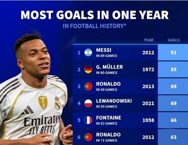 今天凌晨,姆巴佩在西甲对阵阿拉维斯的比赛中打进一球,这来他2025年就打进了63球了,63球在德转的自然年的进球排名中,能够排在第6的位置,和2012年的C罗并列。前五分别是梅西的91球、盖德-穆勒的85球、C罗和莱万的69球、以及方丹的66球。